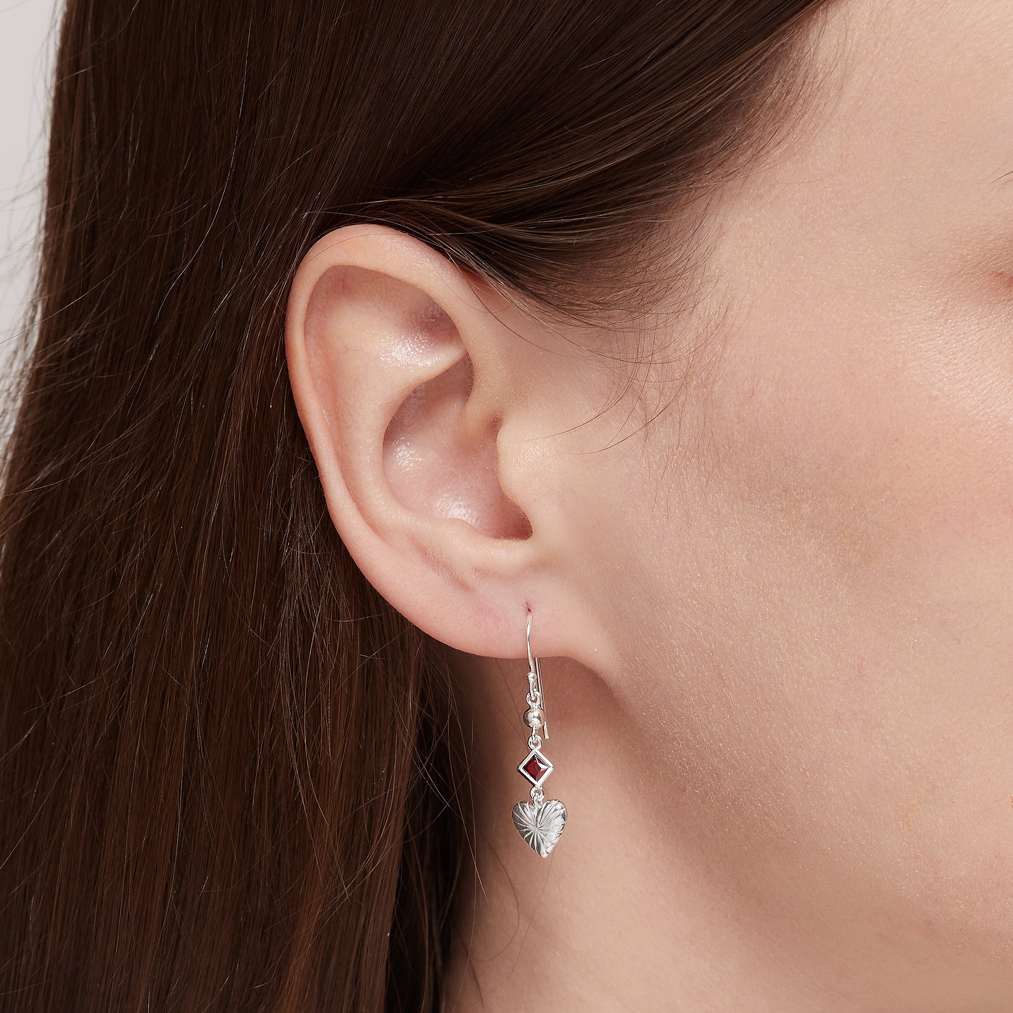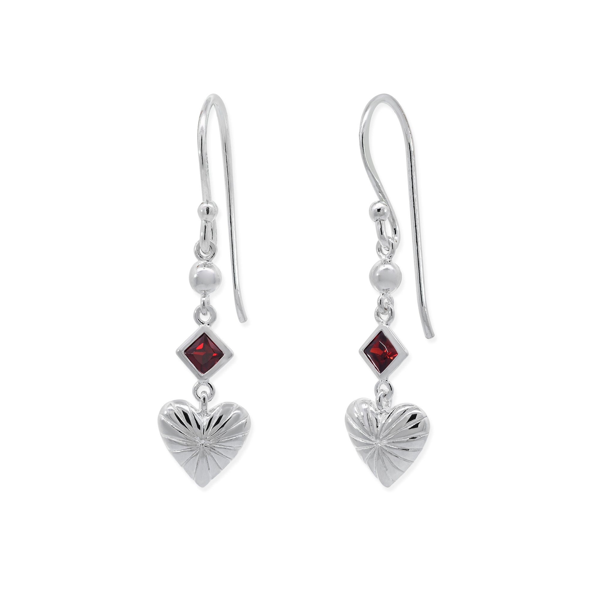 The Clare Heart Dangle Earrings with CZ Garnet feature delicate heart-shaped drops accented with sparkling cubic zirconia garnet stones. The elegant dangle silhouette creates graceful movement, making these earrings easy to wear from day to night.