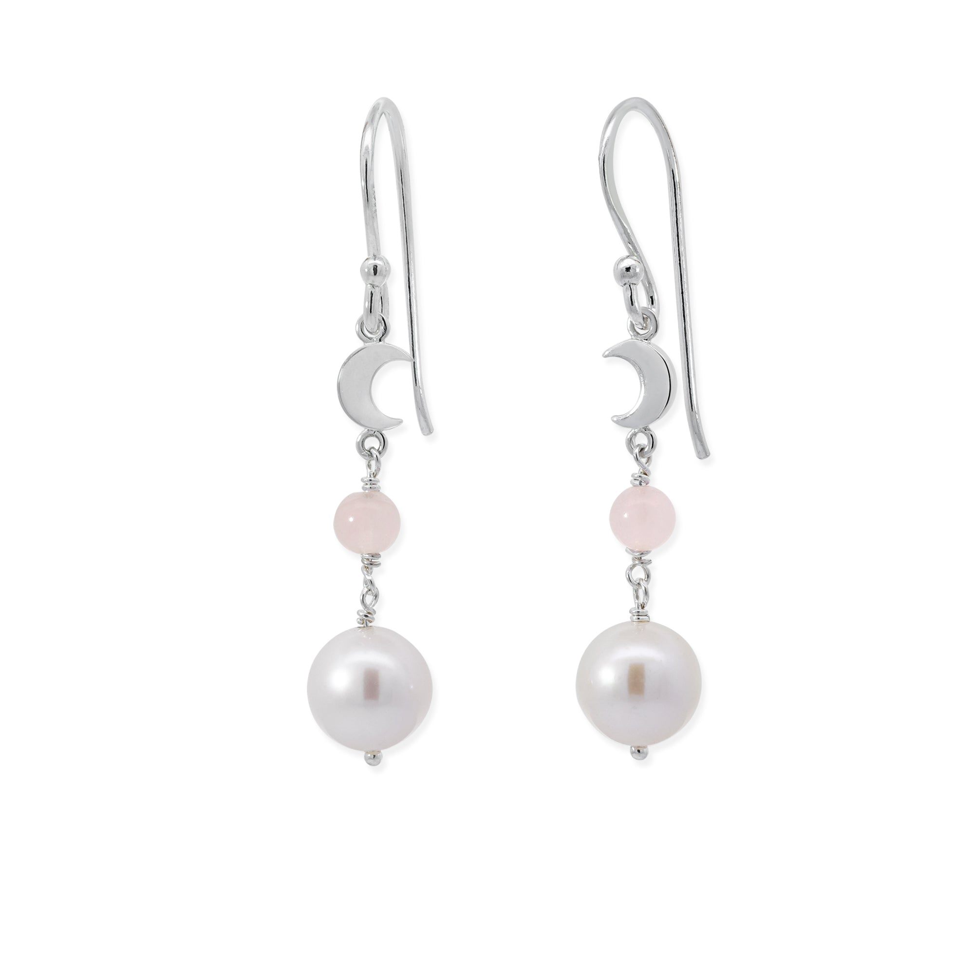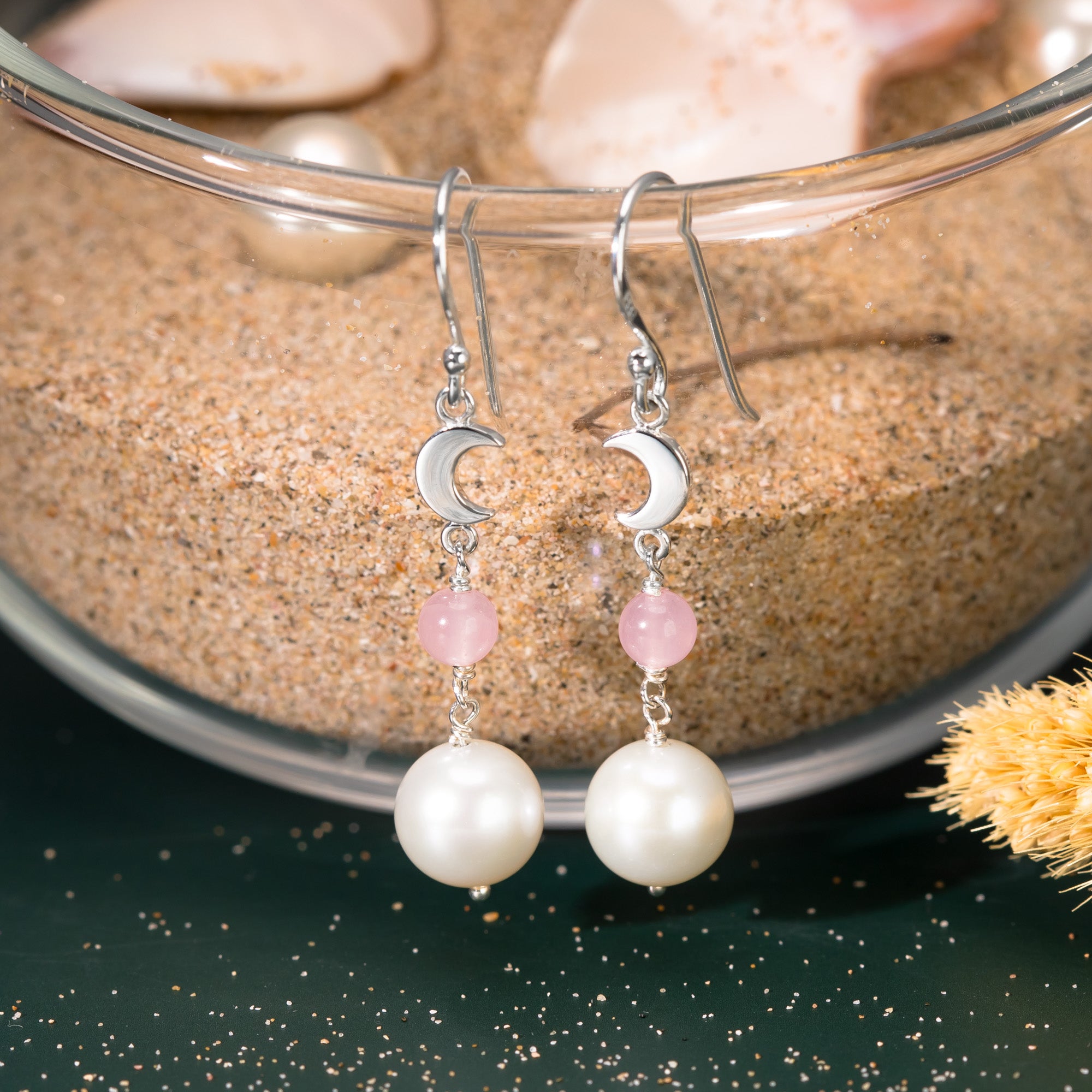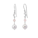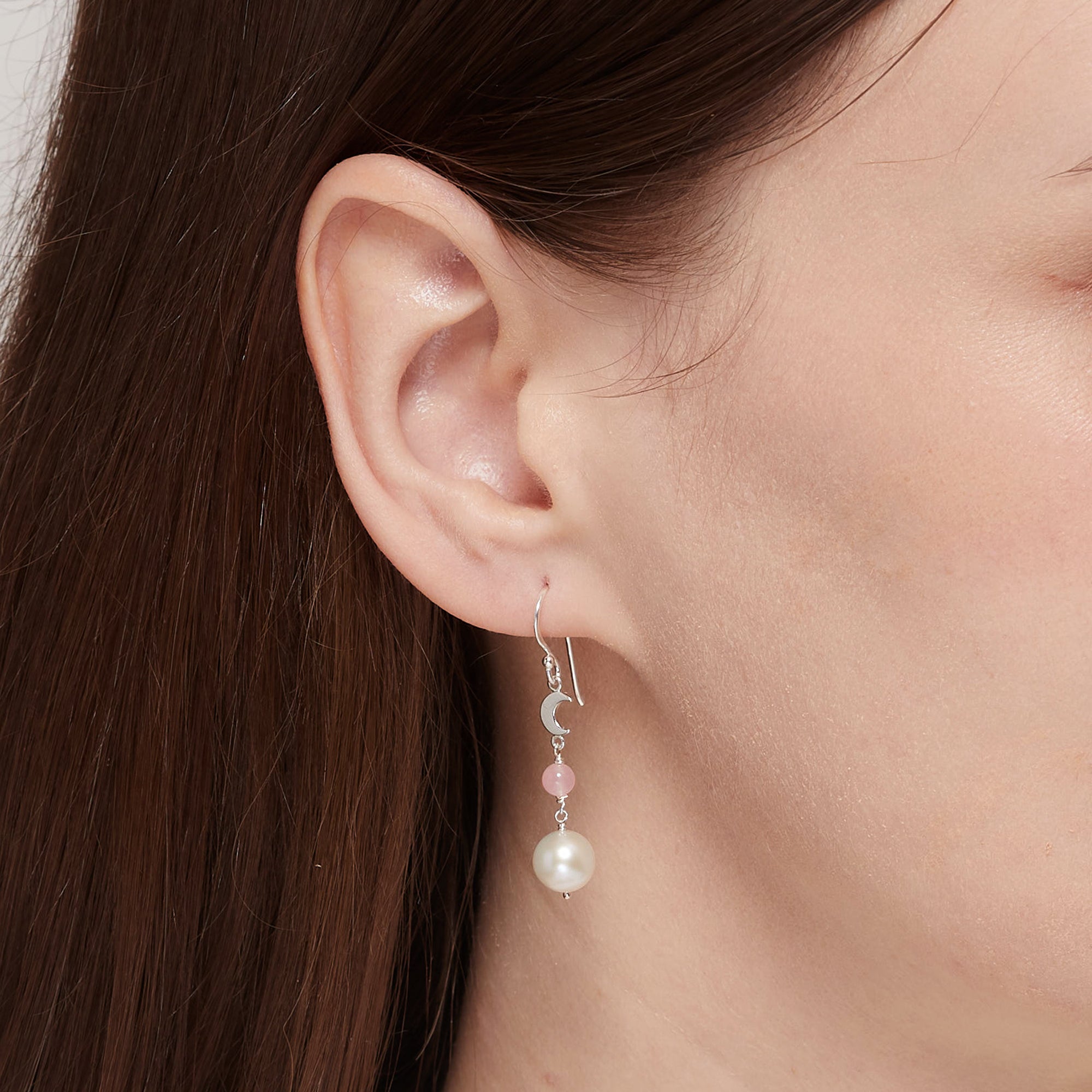 - Dangle earrings featuring freshwater pearls and rose quartz