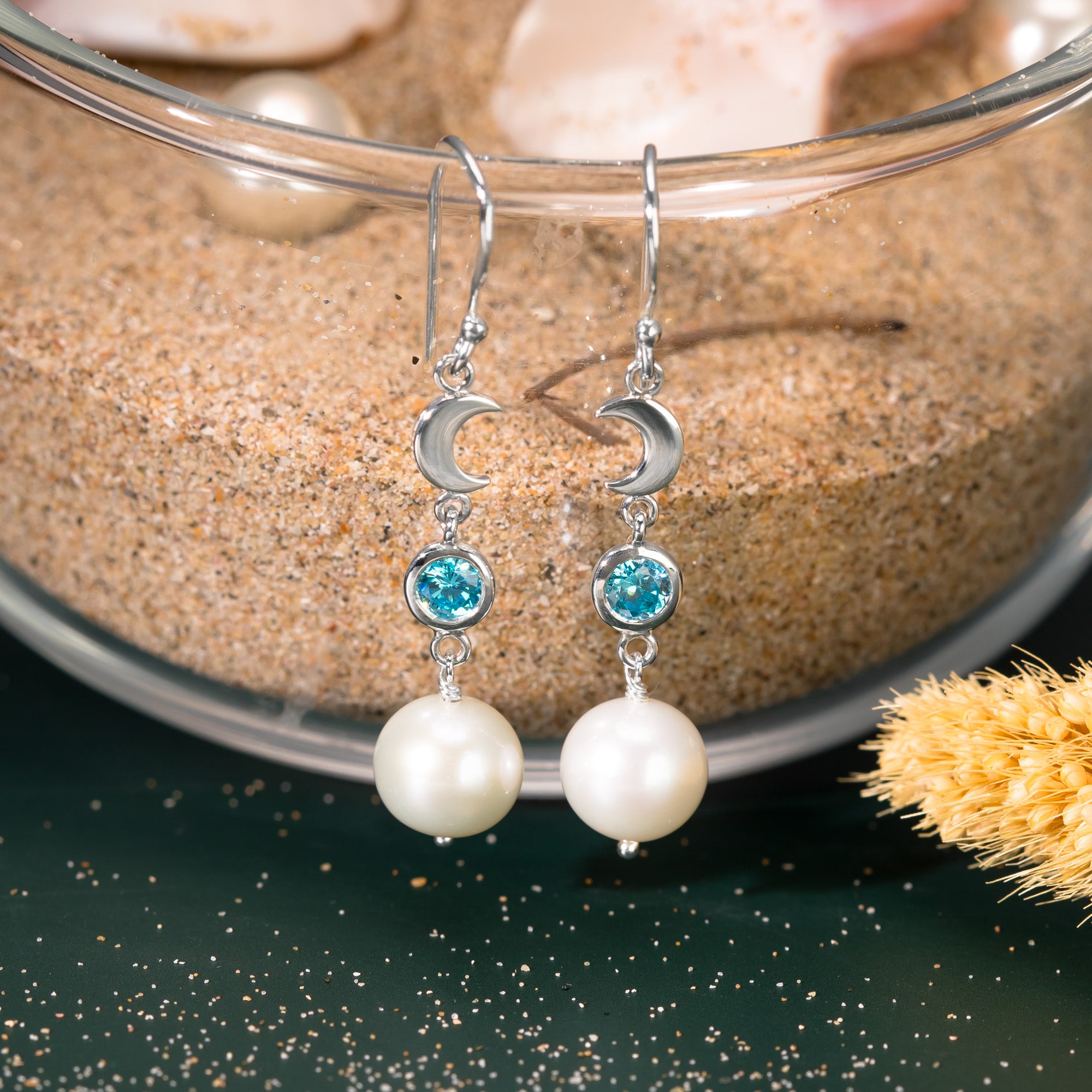 - Dangle earrings featuring freshwater pearls and CZ blue topaz