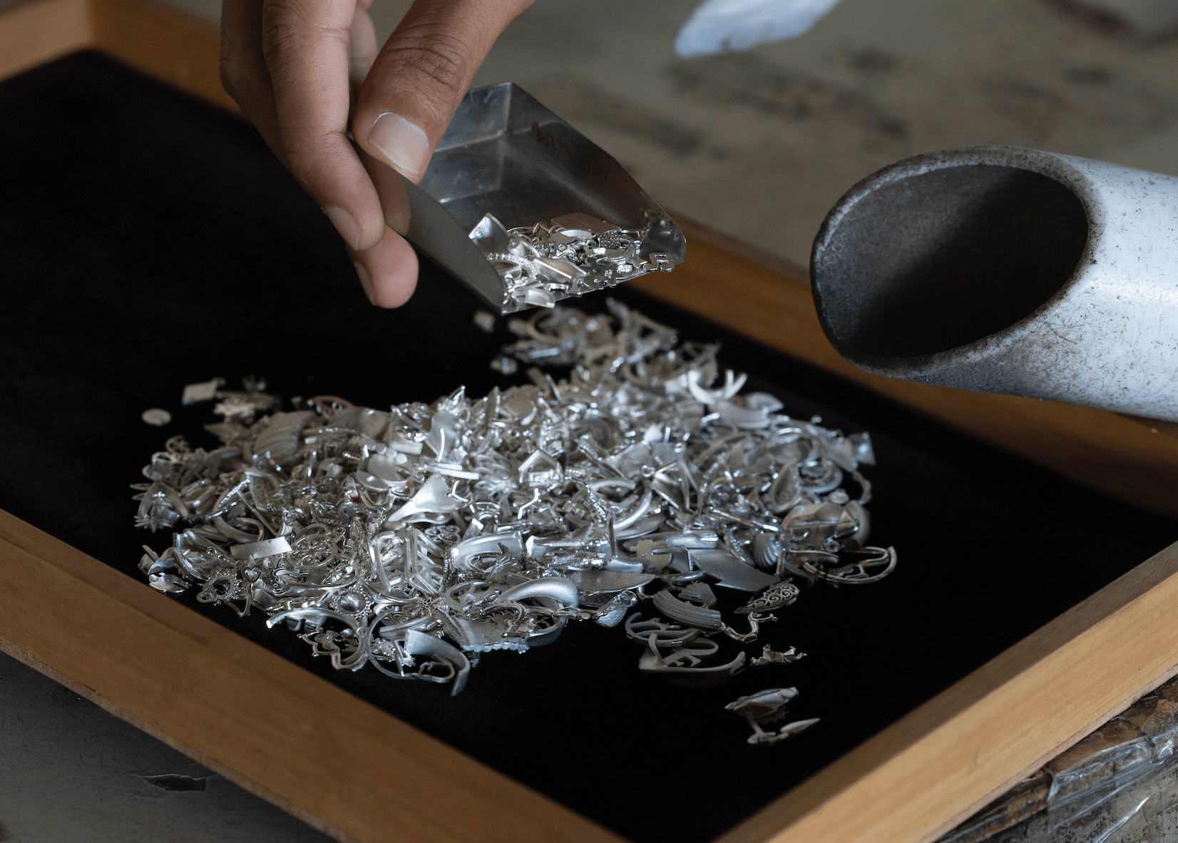 Within our production process, we recycle every bit of silver scrap from the casting process. Any leftover silver isn't thrown away; instead, it's melted down and reused for new pieces. Last year, we recycled over 1,000 pounds of silver from our manufacturing process. That's equivalent to the weight of 200 house cats or 7,000 smartphones!