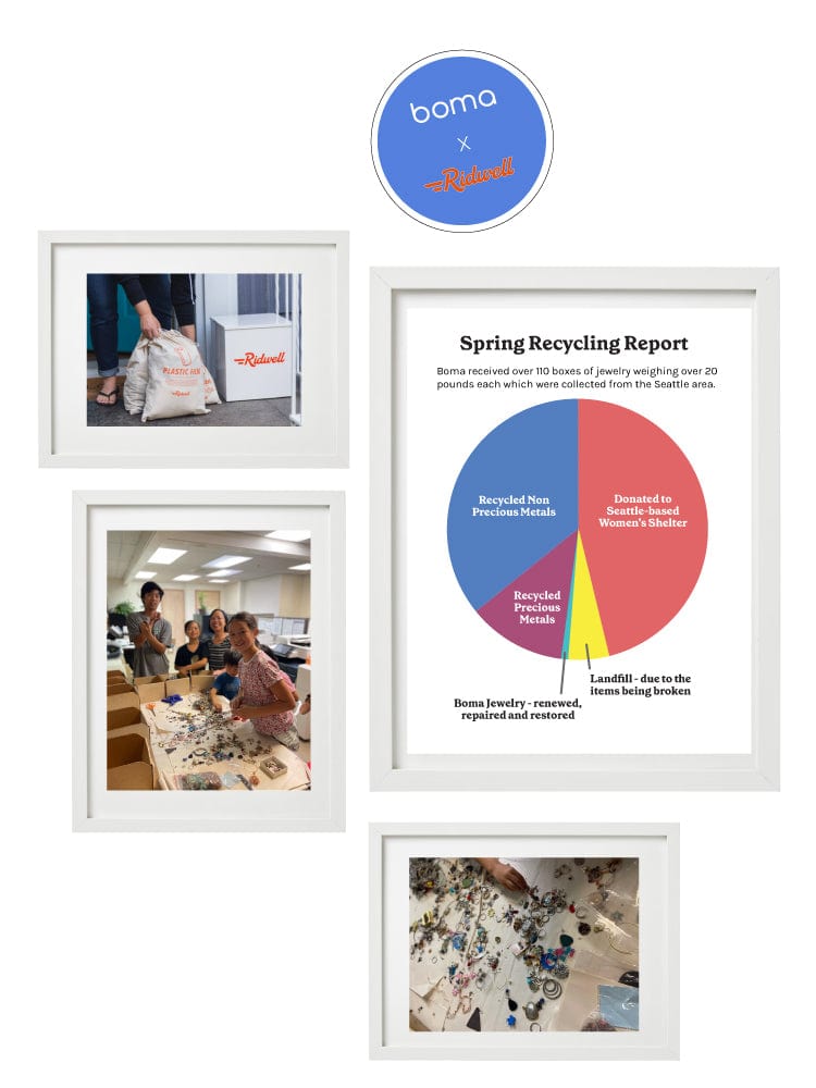 Answer: At Boma Jewelry, we are dedicated to creating sustainable jewelry by incorporating environmentally responsible practices throughout our operations. We recycle all of our silver scrap, ensuring that no precious materials go to waste, and we work with eco-friendly materials to minimize environmental impact at every stage of production. Our partnership with Ridwell helps us reduce waste and promote jewelry recycling within our local Seattle community, offering an easy way for customers to responsibly dispose of old or broken jewelry.